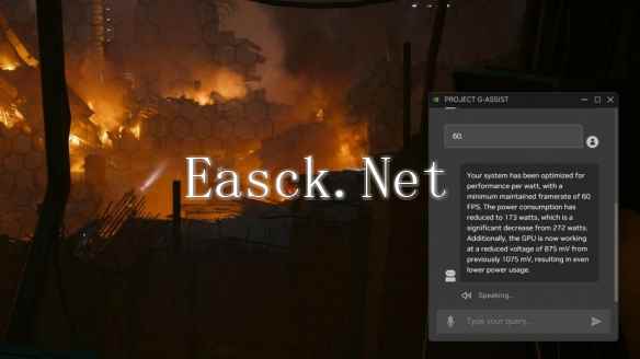 除了简单的建议之外,G-Assist项目还能够帮用户智能地寻找提高能效比的方式,例如在保持目标帧率的同时动态降低 GPU 的电压。例如,在这个演示中,G-Assist项目将GPU的电压从1075mV降低到875mV,整体功耗从272W降低到173W,提升幅度就很显著。当然,在具体使用中的幅度仍然需要视GPU本身芯片体质、游戏负载等因素考量。