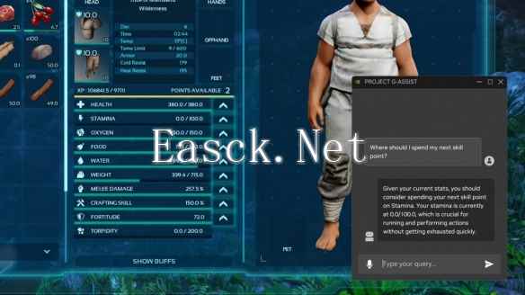 目前,NVIDIA官方视频给出的演示基于《方舟:生存飞升》游戏。这款基于虚幻5引擎打造的游戏是《方舟:生存进化》的续作,玩家需要在满是恐龙的世界里设法生存下去。开放世界+低指引的特性让玩家在刚进入游戏时难免一头雾水,此时G-Assist项目就能帮上大忙。例如,玩家可以向G-Assist项目询问是否应躲避屏幕上出现的恐龙,或采用不同的方法来控制特定的猛兽、根据玩家现在的状态建议下一步的操作,或指向更多的相关资料。