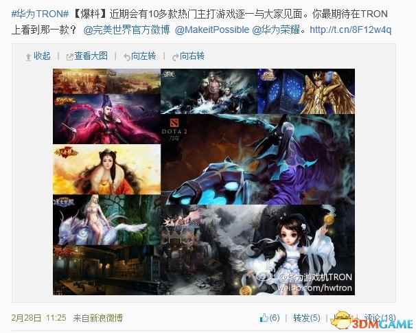 在今年的MWC世界移动通信大会上,华为与完美世界结成伙伴关系共同开辟国内游戏机市场业务,很快两家的合作便有了成果,完美世界为华为TRON主机准备的首批游戏作品遭到曝光。 华为TRON主机官方微博消息显示,完美世界将在近期陆续宣布十余款面向该游戏机的作品,从所缀的图中我们看到备选作品中不仅包括了《笑傲江湖OL》、《倚天屠龙记》、《神雕侠侣》这些传统武侠网游,甚至连《DOTA 2》这样的全球性大型电竞游戏也赫然在列。不免让人从中看到华为和完美进军国内客厅娱乐的野心。 按计划,华为TRON主机将在今年第三季度正式上市,而在此之前该产品很可能会亮相7月末与ChinaJoy同时召开的国内首届游戏机展(ACH)。