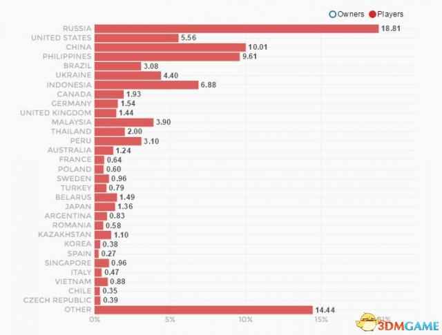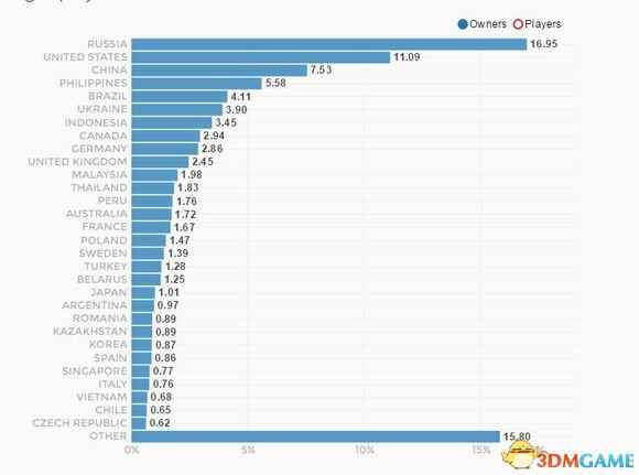 透过上图我们看到,《DOTA2》玩家人数最多的并不是中国,而是俄罗斯。中国排第二(10%)。第三名是菲律宾(9.6%),仅次于中国,可能也出乎了大家的意料。第四名是印尼,第五名才是美国。 下面这张是Steam上《DOTA2》这个游戏的各国占有比,第一名仍然是俄罗斯,达到了16.95%。其次是美国,第三名才是中国,达7.53%,仅仅俄罗斯的一半。