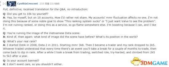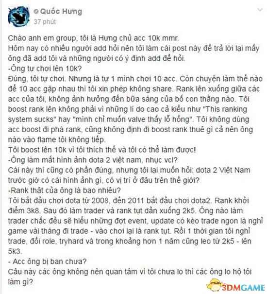 现在他终于自知有过,在社交网络上公开道歉了。 ![]() 这是一位越南玩家,有热心的网友对这段文字进行了比较粗略的翻译。大致还是能看懂。 ![]() 内容大概就是他是自己开10个号刷的分,他这么做也不是为了让V社知道有这么一个漏洞在以便他们立即去改正,他没有在毁掉天梯比赛,他只是喜欢这么做,而且关于越南DOTA在世界上的印象他根本不知道那是什么,他从2008年开始玩《DOTA》,2011年开始玩《DOTA2》从3800分到2500,再到5300,至于V社会不会封号,他不在意,所以别人也不用在意。