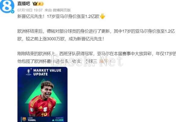 据直播吧报道,欧洲杯结束后,德转对部分球员的身价进行了更新,其中17岁的亚马尔身价涨至1.2亿欧,较之前上涨3000万欧,成为新晋亿元先生!