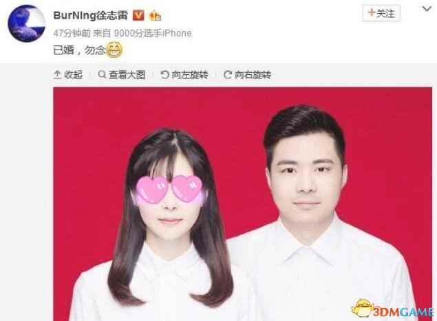 在全段时间的《DOTA2》亚洲邀请赛上,凭借“B神”的出色发挥,IG以3:0的比分零封OG,取得大赛冠军,作为中国《Dota》界著名选手BurNIng徐志雷,堪称一代《Dota》玩家的偶像。今天这位世界顶级carry又取得了人生路上的新成就:B神结婚啦。