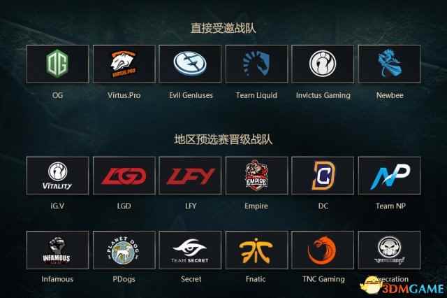 中国区晋级战队: iG.V LFY LGD 东南亚晋级战队: TNC Gaming Fnatic Execration 欧洲区晋级战队 Team Secret PDogs 独联体晋级战队 Empire 北美区晋级战队 Team NP DC 南美区晋级战队 Infamous 【主赛事赛制】 今年盛夏十八支战队将飞赴西雅图争夺冠军之神盾,参赛队伍由六支直接受邀战队和十二支地区预选赛中晋级的队伍组成。十八支队伍将分为两组进行循环赛,每组成绩垫底的队伍将率先被淘汰,剩下的十六支战队将于北京时间8月8日——13日在钥匙体育馆的双败淘汰制主赛事。 让我们共同期待那一时刻的来临!