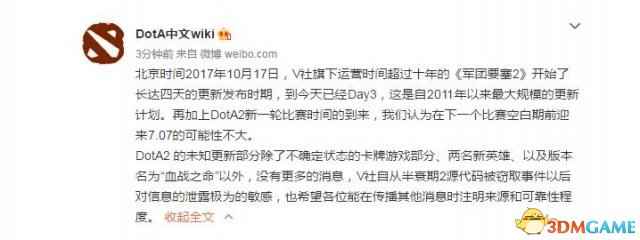 除了两名新英雄外,外界盛传的版本大更新7.07也很有可能一起同步推出。 值得一提的是,昨天DOTA中文Wiki在微博中辟谣,表示最近盛传的DOTA2更新日志是玩家自制的,可信度并不高。