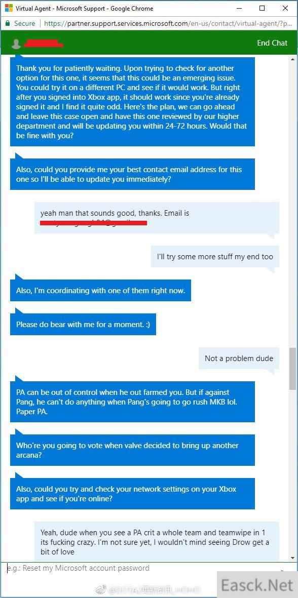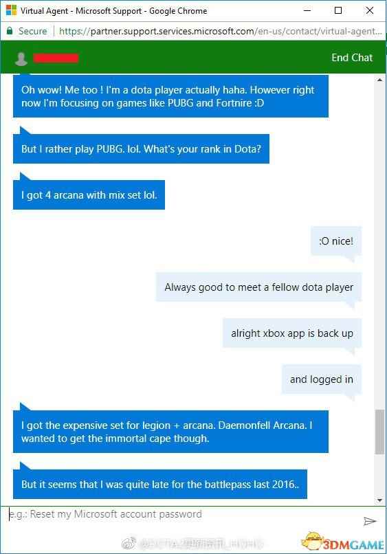 近日国外一位玩家在Xbox One上玩《贼海》时遇到些问题,于是找微软客服帮忙,但聊着聊着却发现客服和他一样,都很喜欢玩《DOTA2》,于是俩人狂聊起来。