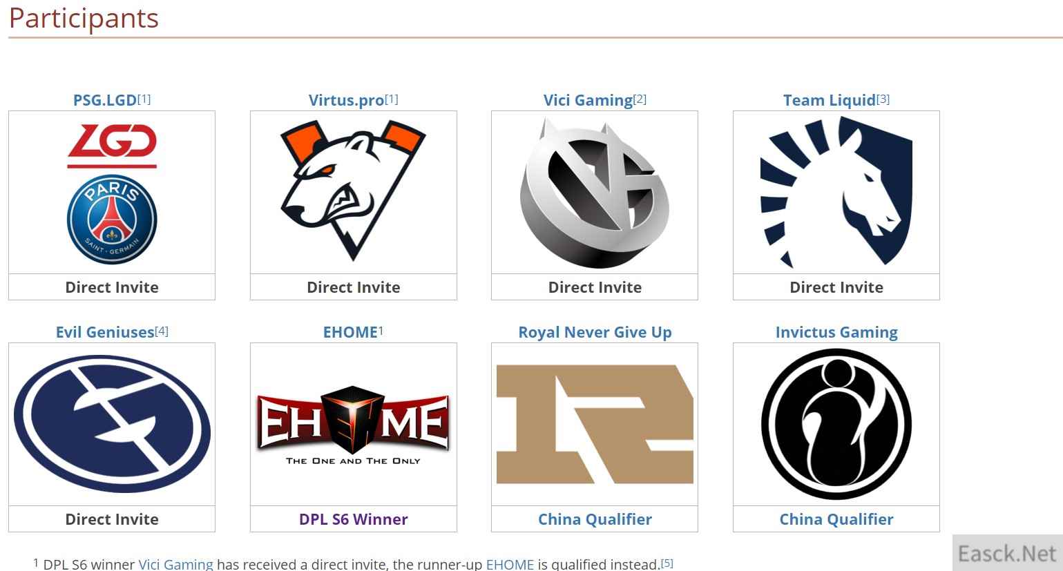 各大赛区出线队伍: 中国赛区:LGD,Ehome,KG 欧洲赛区:NIP,秘密,液体 独联体赛区:VP,Navi 东南亚赛区:Fnatic,Mineski 北美赛区:EG,J.Storm,Forward Gaming 南美赛区:Chaos,Infamous