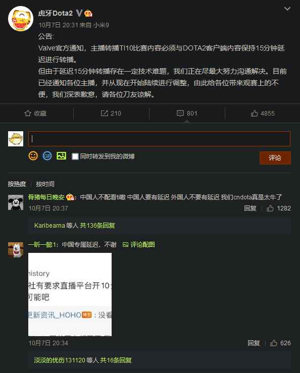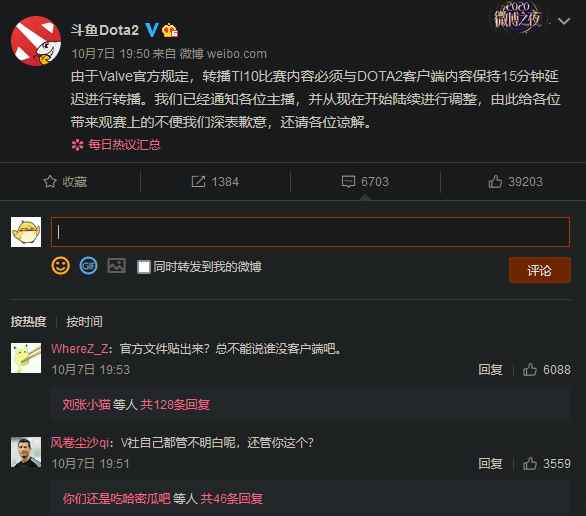 这场纯线上转播的TI比赛自然引来诸多粉丝前来观看,但是就在小组赛开赛当天,V社对于国内直播的管理要求却引起了许多争议,而#DOTA2延迟#也登上了微博热搜榜第三名。 根据斗鱼TV等直播平台的微博消息称,由于V社官方规定,转播比赛内容必须与客户端内容保持 15 分钟的延迟。