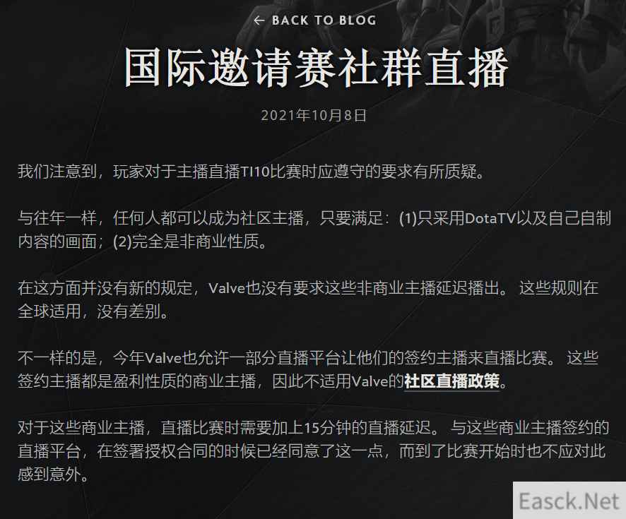 在今天(10 月 8 日),V社官方作出回应,发表了一篇名为《国际邀请赛社群直播》的文章。文章中表示,非商业性质的社区主播并没有被要求延迟转播,但是今年 V 社允许一部分直播平台让签约主播直播比赛。签约主播都是盈利性质的商业主播,因此不适用 V 社的社区直播政策。对于这些商业主播,直播比赛时需要加上 15 分钟的直播延迟,同时主播签约的直播平台在签署授权合同时已经同意了这一点。