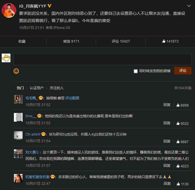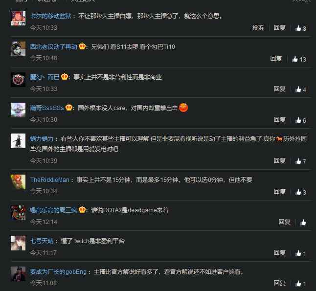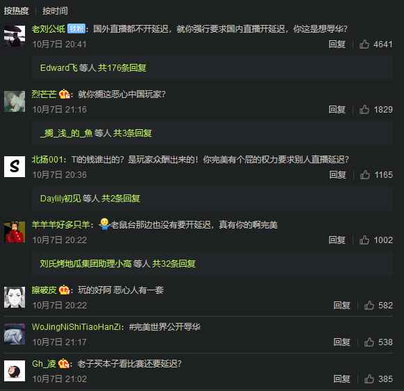 但是随后 iG 战队选手月夜枫 YYF 和斗鱼 TV 主播 Zard 纷纷表示,国内外存在区别对待现象。国内直播平台转播比赛需要 15 分钟延迟,但是国外直播平台 Twitch 上,依然有许多转播并没有进行延迟。此外,比赛延迟并不是游戏中进行设置的,而是需要主播在直播间设置延迟观看,极大影响了主播和观众之间的互动,引发了主播的不满。而这种区别对待也引发了许多国内玩家的不满。