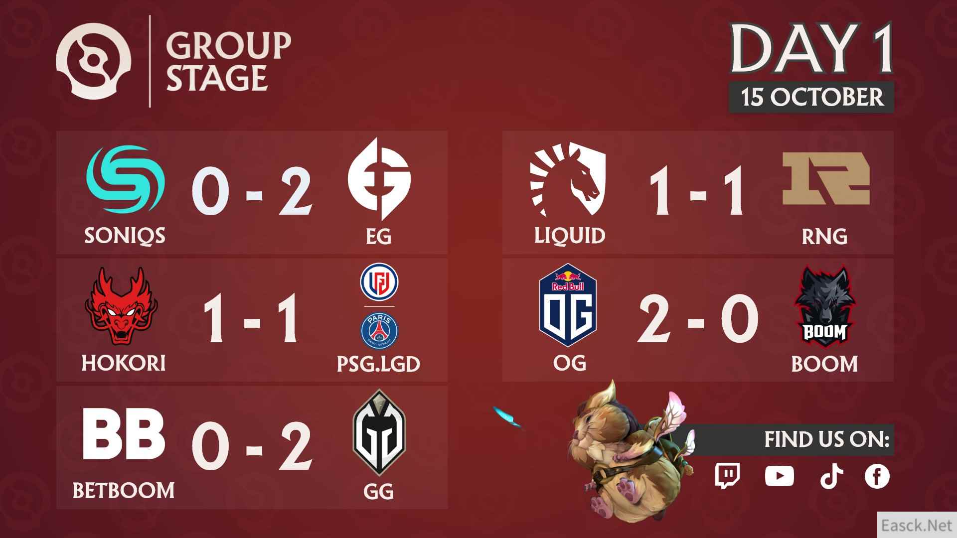 小组赛第一轮结果如下: SONIQS 0 : 2 Evil Genius Liquid 1 : 1 RNG HOKORI 1 : 1 PSG.LGD OG 2 : 0 BOOM BETBOOM 0 : 2 GG