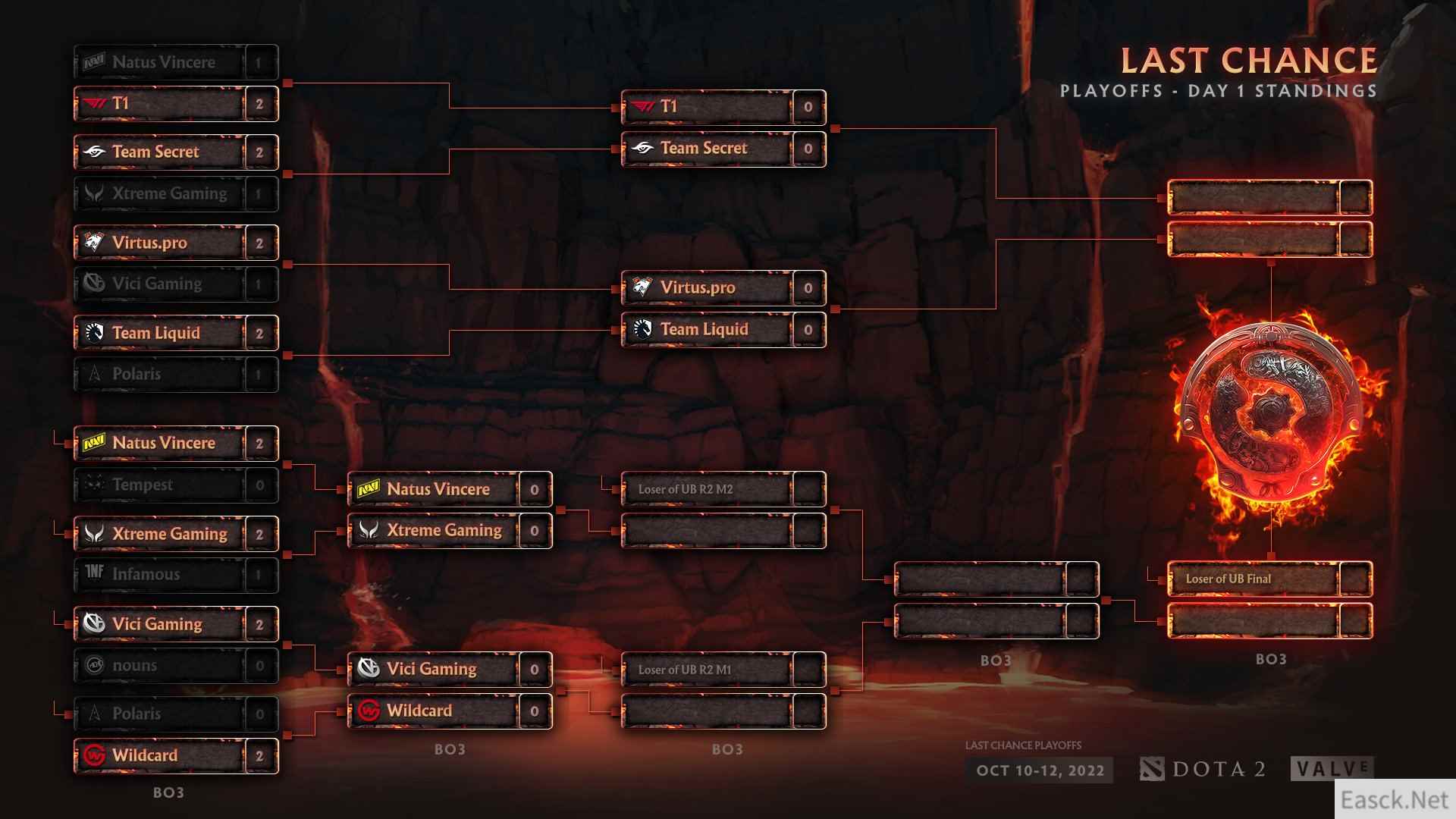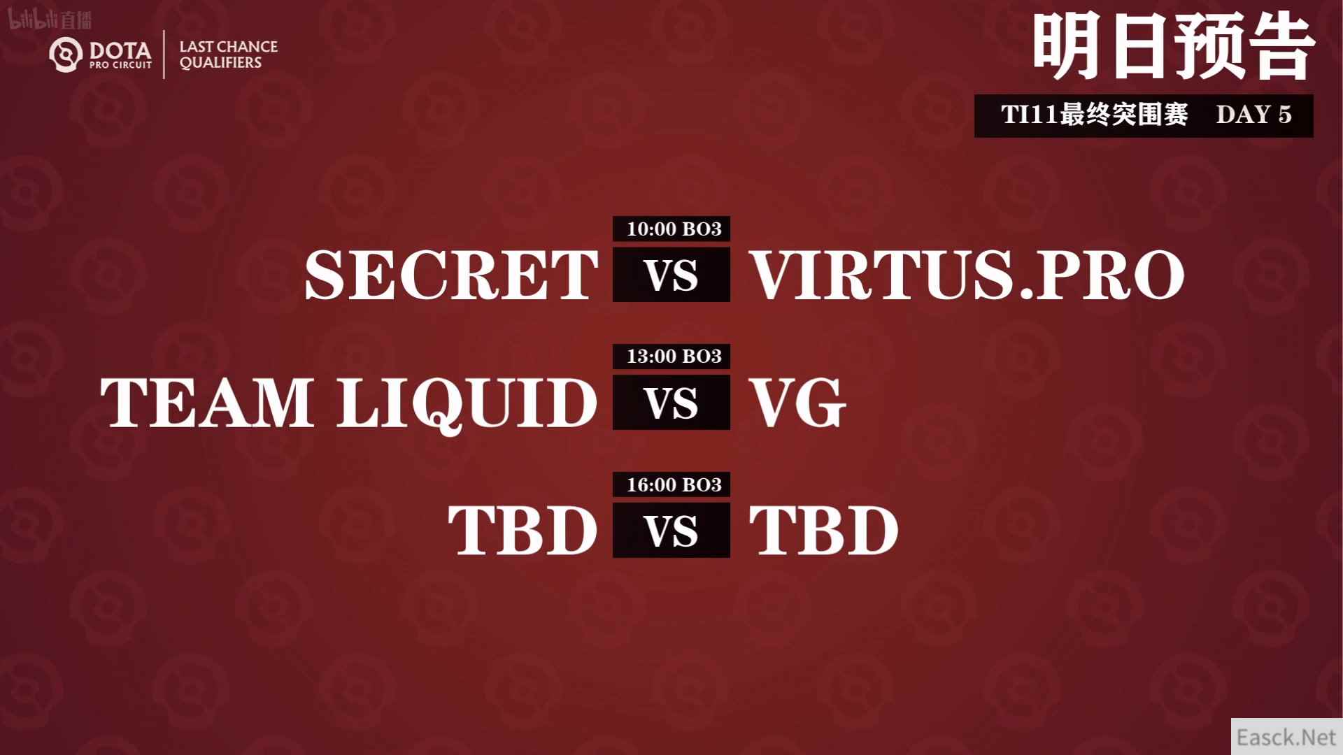 胜者组决赛 10:00 Secret vs VP (解说:Sdn ZSMJ) 败者组 13:00 Liquid vs VG(解说:圣子华炼 ZSMJ) 败者组决赛 16:00 待定 vs 待定 (解说:Sdn 圣子华炼) 本次淘汰赛不设置总决赛,胜者组决赛胜者和败者组决赛胜者将晋级TI11主赛事