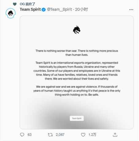 TI10冠军Team Spirit发推:反对战争 珍爱和平