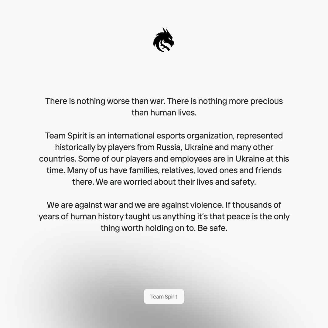 Team Spirit是一家俄罗斯电竞俱乐部,位于俄罗斯莫斯科,成立于2015年,目前拥有《CS:GO》《DOTA2》《英雄联盟》和《炉石传说》等队伍。他们的DOTA2队伍赢得了2021年国际邀请赛,获得了电竞历史上最高奖金:1800万美元。 声明如下: “没有比战争更糟糕的事情,没有比人类生命更宝贵的。 Team Spirit是一家国际电竞组织,从历史上就由来自俄罗斯,乌克兰和很多其他国家的选手组成。这个时候,我们的一些选手和员工正在乌克兰。我们很多人在乌克兰有家庭,亲人,所爱之人和朋友。我们很担心他们的生命和安全。 我们反对战争,我们反对暴力。如果数以千年的人类历史能告诫我们的话,那就是和平是唯一值得坚持的事情。注意安全。”