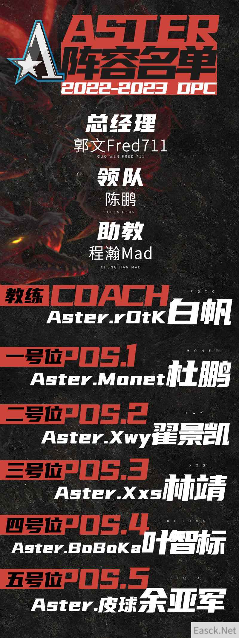 名单如下: 总经理 郭文Fred711 教练 白帆rOtK 领队 陈鹏 助教 程瀚Mad 一号位:Aster.Monet 杜鹏 二号位:Aster.Xwy 翟景凯 三号位:Aster.Xxs 林靖 四号位:Aster.BoBoKa 叶智标 五号位:Aster.皮球 余亚军 DOTA2 TI11国际邀请赛,Aster战队是走地最远的一支中国队,获得第四名。
