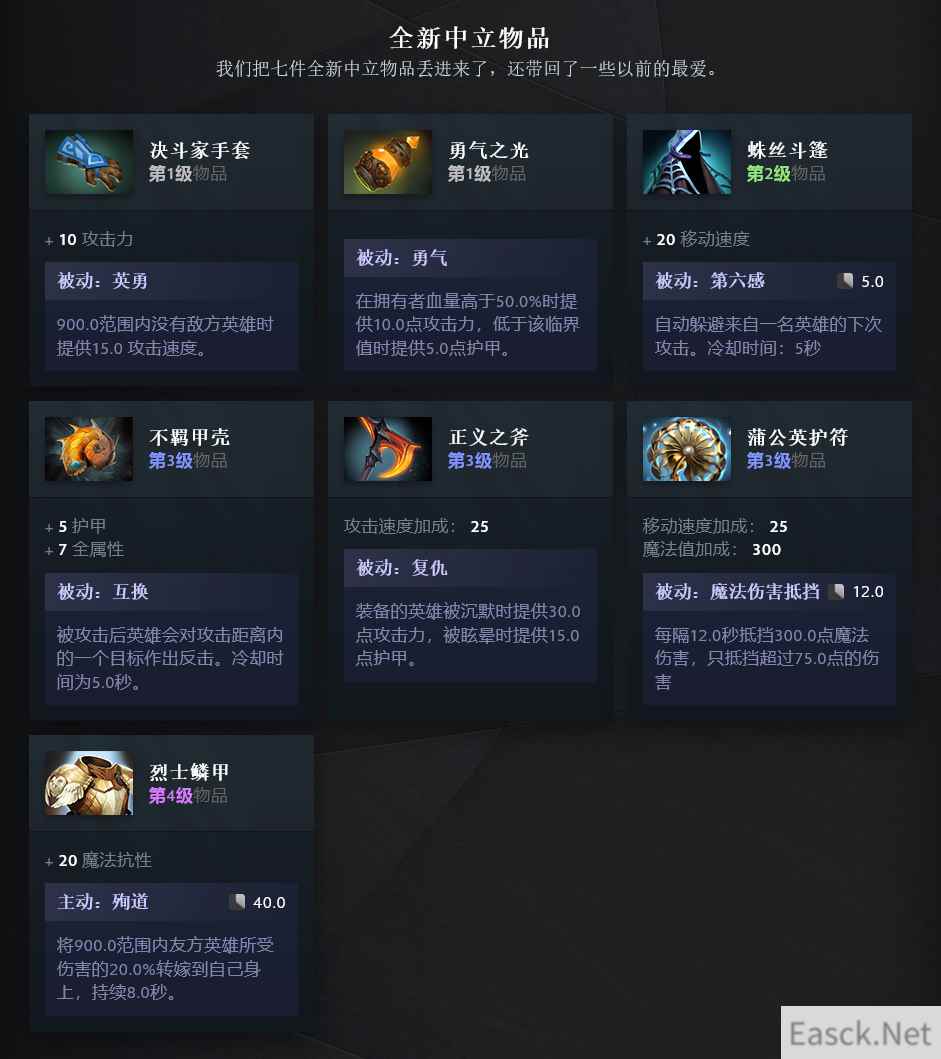 全新的中立物品如下: