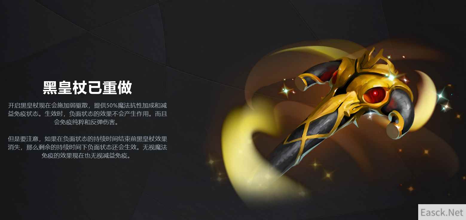 在物品改动方面,可以说游戏中最重要的物品之一黑皇杖 BKB 在新版本中进行了重做。现在开启黑皇杖会施加若驱散,提供 50% 的魔法抗性加成和减益(Debuff)免疫状态。开启时负面状态效果不产生作用,并且会免疫纯粹和反弹伤害(无视刃甲和反伤技能)。具体效果是啥样还得去游戏里尝试以下才清楚。