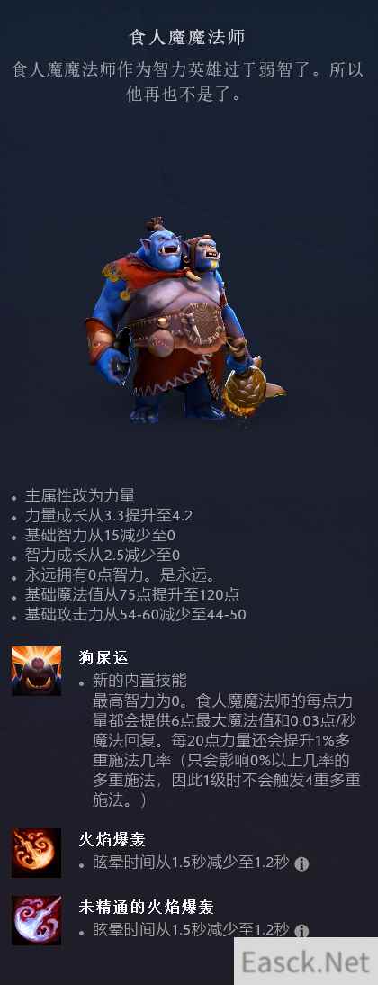 其实改动最重要的一点是:蓝胖(食人魔魔法师)终于“滚出智力界”了。它现在是一名力量英雄,并且智力将“永远是 0 点”。它获得了一个新的模型被动,将通过力量点数来获得魔法值和魔法回复速度。并且力量还会让他的“多重施法”运气增加。