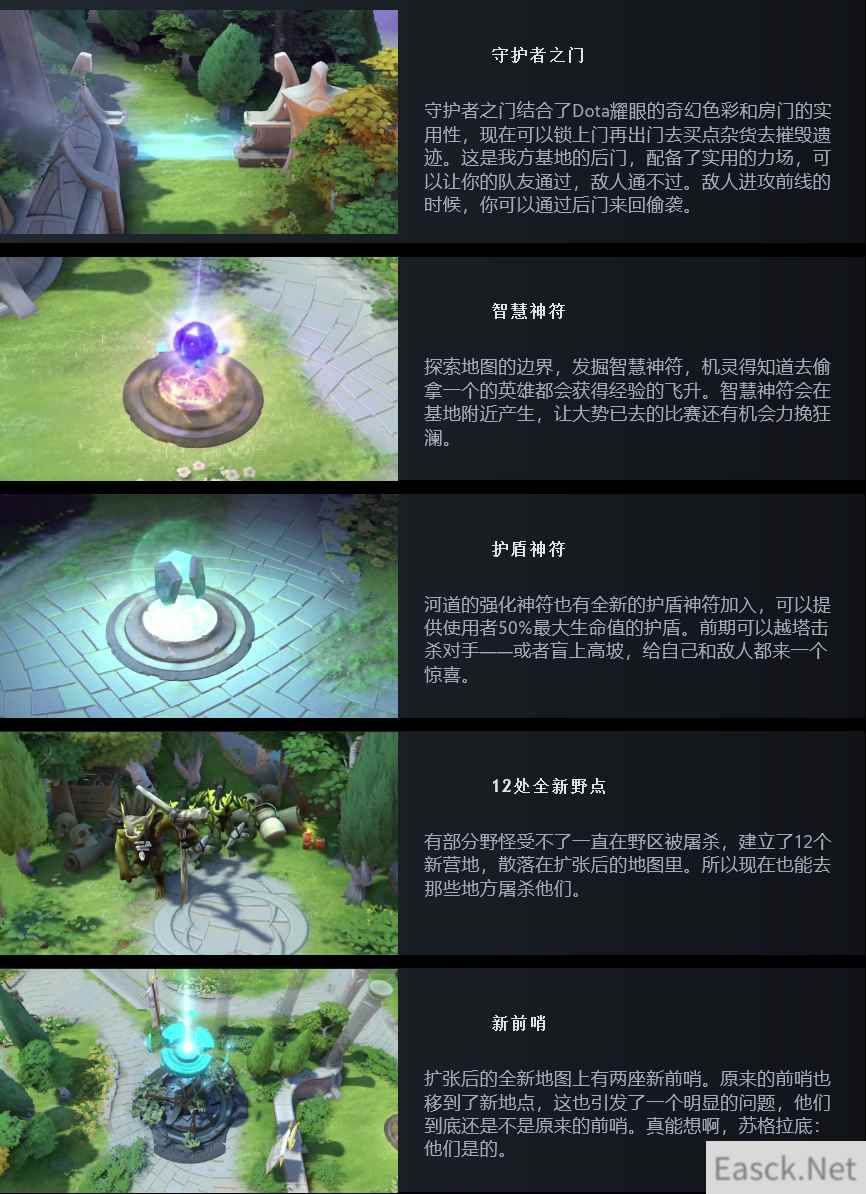 新的地图改动还包括“守护者之门”的防御性机制(地图大了还多了个门,游戏一把现在两小时起步?)以及两个全新的神符、12 个新的野怪刷新点,以及前哨位置的改改变。