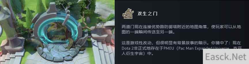 这些小径除了野怪刷新位置以外,也包括新的建筑物。《传送门》终于联动《DOTA2》了!新建筑物“双生之门”就坐落在两家的优势一、二塔附近,玩家可以从地图的一端迅速传送至另一端。