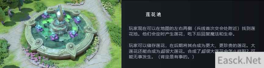 除此之外新地图的野区还出现了一个名为“莲花池”的建筑,它们会定期产生消耗品“莲花”,吃下后可以回复魔法和生命值。但是如果选择不吃而是存着,那么玩家能够将其合成大莲花和超级大莲花。目前暂不清楚这些物品的作用。