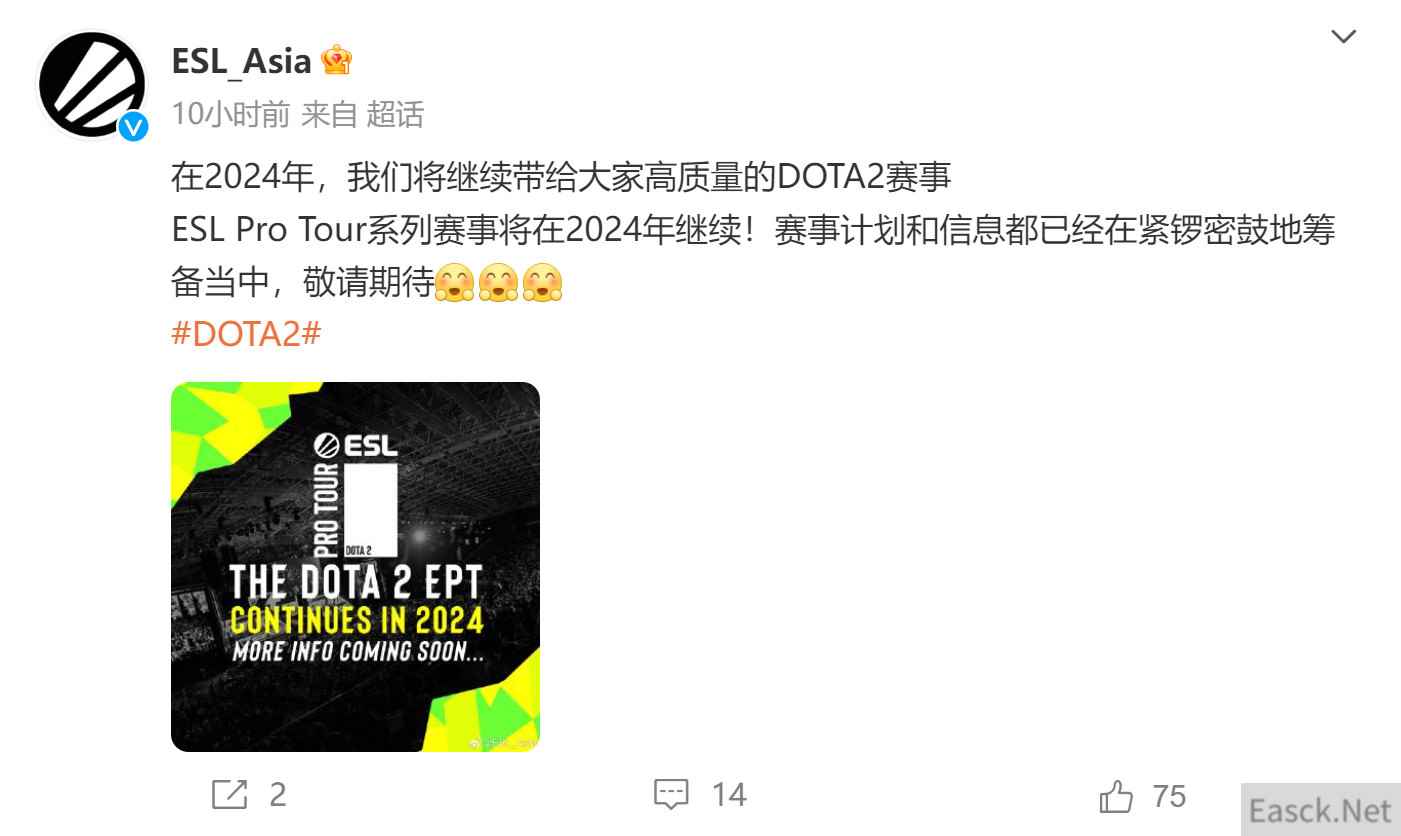 与此同时,知名第三方赛事组织方ESL宣布2024年将继续给大家带来高质量的DOTA2赛事,“ESL Pro Tour系列赛事将在2024年继续!赛事计划和信息都已经在紧锣密鼓地筹备当中,敬请期待”。