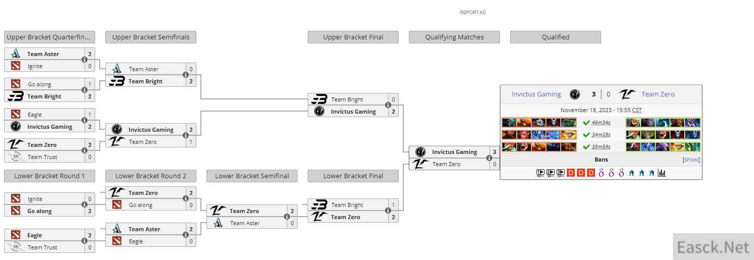 赛后IG官博: ESL ONE 吉隆坡站中国区封闭预选赛,iG在决赛中3:0战胜Team Zero,以中国区第一名的身份晋级本次ESL ONE吉隆坡站正赛。恭喜小伙子们,也感谢一直以来支持我们的粉丝。我们将继续加强磨合,精细战术,调整状态,争取在吉隆坡取得好成绩。门票只是开始,我们的梦仍与更高的荣誉相连!