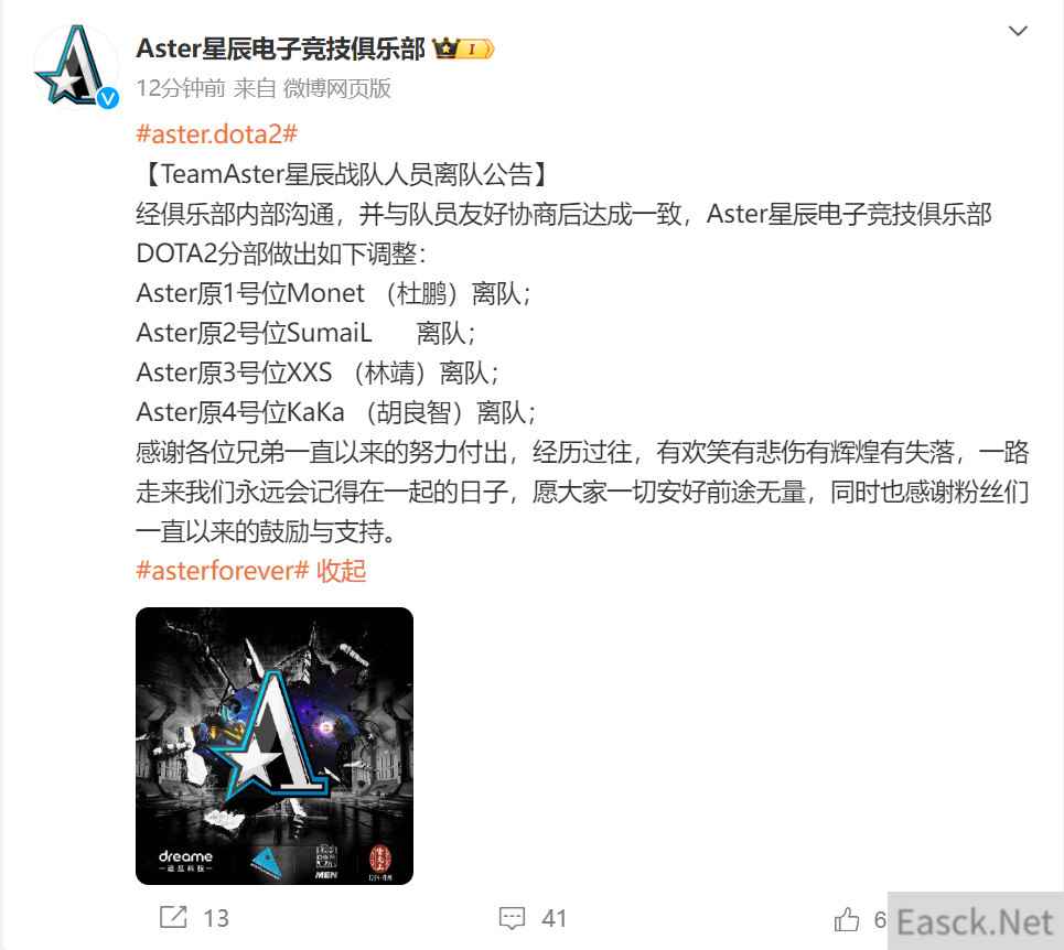 公告如下: 【DOTA2】在双方友好协商并尊重选手意愿的前提下,原Aster电子竞技俱乐部选手杜鹏(ID:Monet)以自由人身份加入iG.DOTA2分部,担任一号位;原XG电子竞技俱乐部选手郑竣文(ID:JT-)以自由人身份回归iG.DOTA2分部,担任三号位;原Aster电子竞技俱乐部选手叶智标(ID:BoBoKa)以自由人身份加入iG.DOTA2分部,担任四号位;原Boom俱乐部选手叶建暐(ID:xNova)以自由人身份加入iG.DOTA2,担任五号位。 LGD电子竞技俱乐部选手庄进祥(ID:NothingToSay)转会至iG.DOTA2分部,担任二号位。 欢迎Monet、NothingToSay、xNova三位选手加入iG.DOTA2的大家庭,希望我们在新赛季一同携手共进,追逐我们共同的梦想。 欢迎JT-与BoBoKa重回iG,我们期待继续看到JT-用自己的笑容感染队友与观众,也期待看到BoBoKa选手的成长。 ESL的海选即将到来,我们将加紧备战,争取在新赛季取得一个更好的成绩! iG.DOTA2 成员名单: 教练:super 苏鹏 @ dogf1ghts 高天鹏 领队:Yakult 王昊 一号位:Monet 杜鹏 二号位:NothingToSay 庄进祥 三号位:JT- 郑竣文 四号位:BoBoKa 叶智标 五号位:xNova 叶建暐 同时,Aster战队发布了公告,宣布包括Sumail在内的四名选手离队: