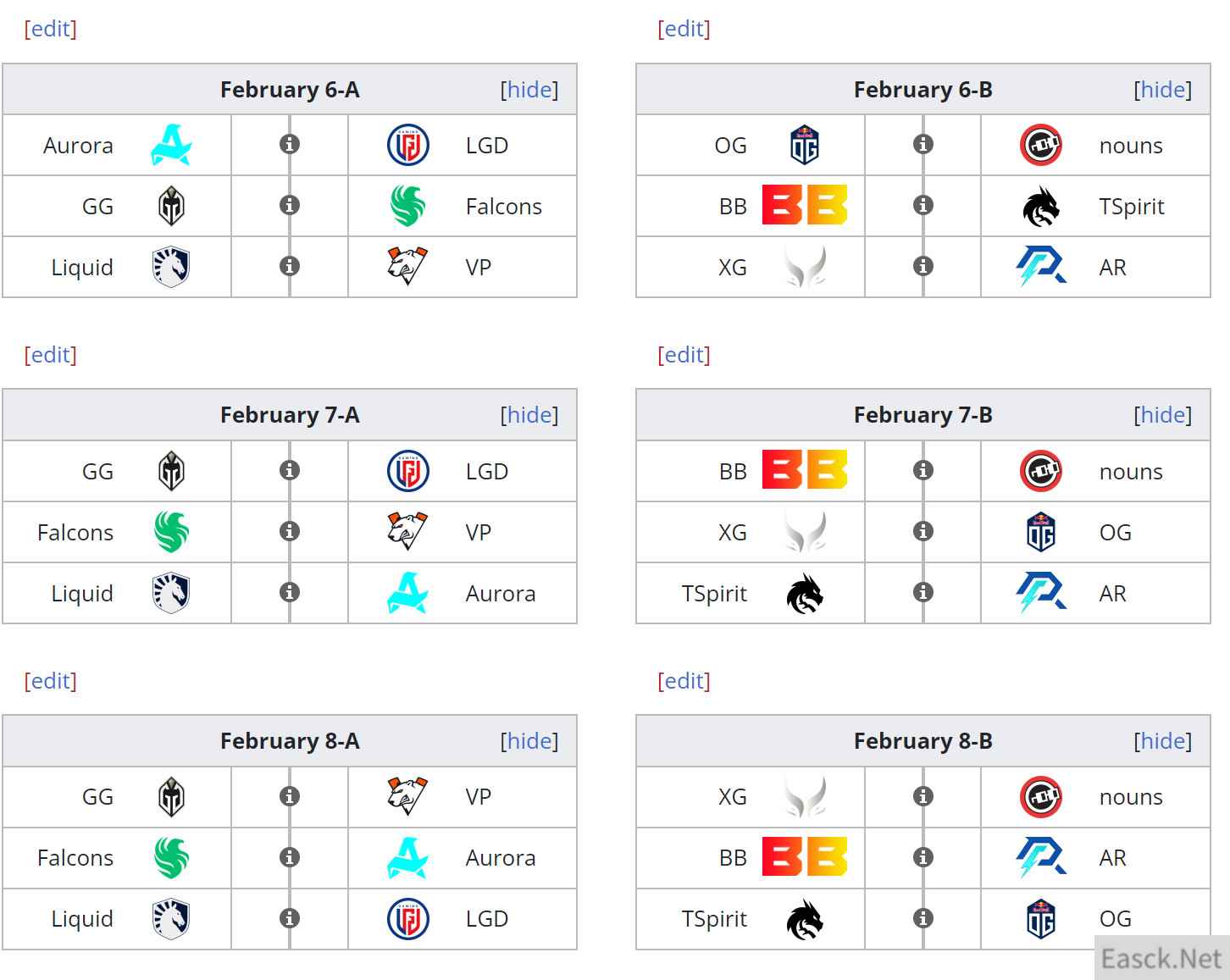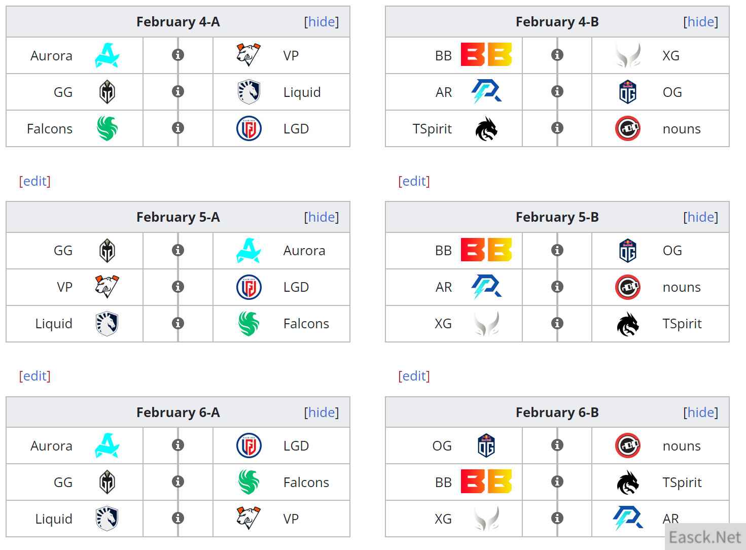 A组: Aurora GG LGD Team Falcons 液体 VP B组: AR BB Nouns OG Team Spirit XG 首轮比赛将于2月4日进行,A组LGD将对阵Falcons,而AR将对阵状态同样火热的OG战队,XG对阵BB。
