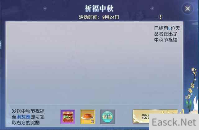中秋团圆夜,嫦娥仙子也临凡!活动期间“嫦娥寻踪”将持续开放,天命者们每天都能在圆月这下寻找嫦娥的踪迹、获取璀钻奖励!中秋节当天,还有“祈福中秋”活动开启,只要在活动界面发送中秋祝福到朋友圈里,即有丰厚奖励送上!