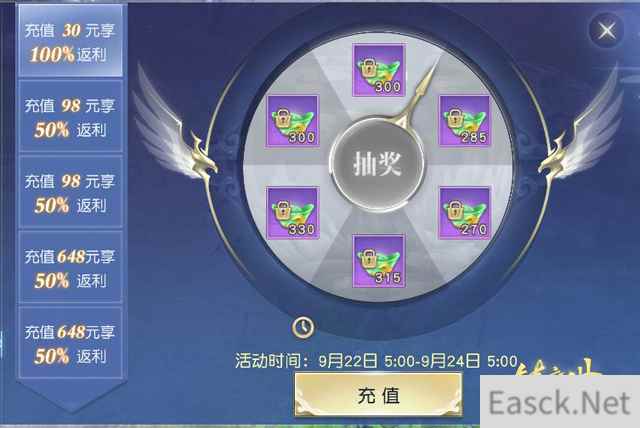 “次次精彩”、“步步夺金”、“豪情回馈”三重活动,只要充值指定档位、累计金额或累计天数,即有六个阶段的不同福利送上!还有“摩天轮盘”转出额外绑定元宝!