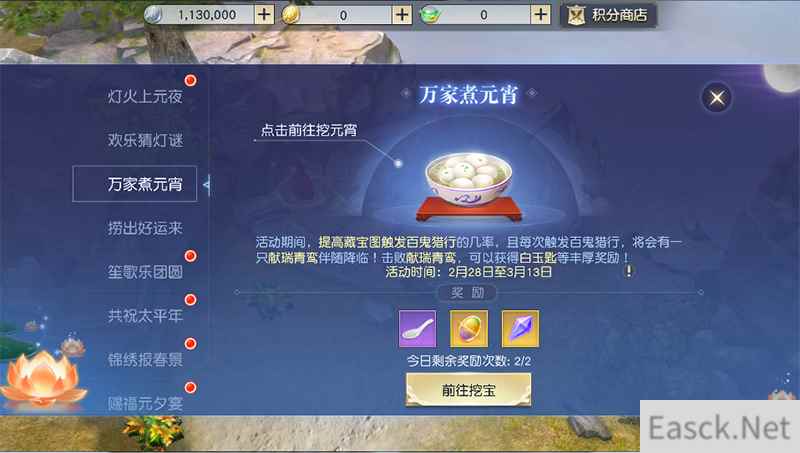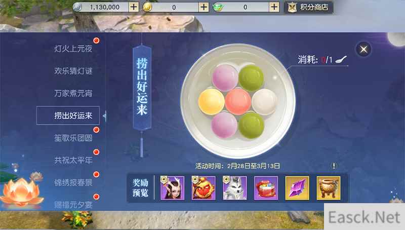 通过万家煮元宵、锦绣报春景、赐福元夕宴、共祝太平年等活动获得的白玉匙,将让天命者们拥有捞元宵的机会!在这里天命者们能捞出神兽元魂、璀钻、七星鼎、艺人宝匣、天宫诏书等稀有奖励,就看大家的运气咯!