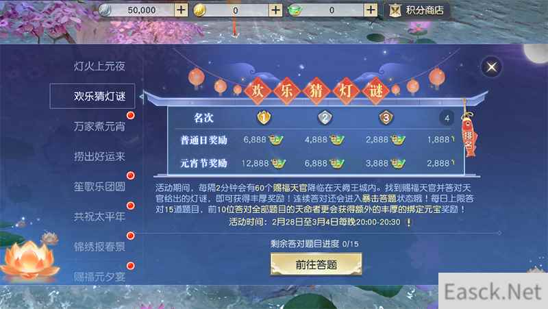 从今天开始到3月4日,每天晚上20点至20点30天阙王城中都会不断刷新赐福天官。天命者们只要找到他们并参与猜灯谜活动,只要答对问题就能获得海量经验、银币、绑定元宝等好礼!如果运气暴棚出现暴击,还有额外绑定元宝奉上!
