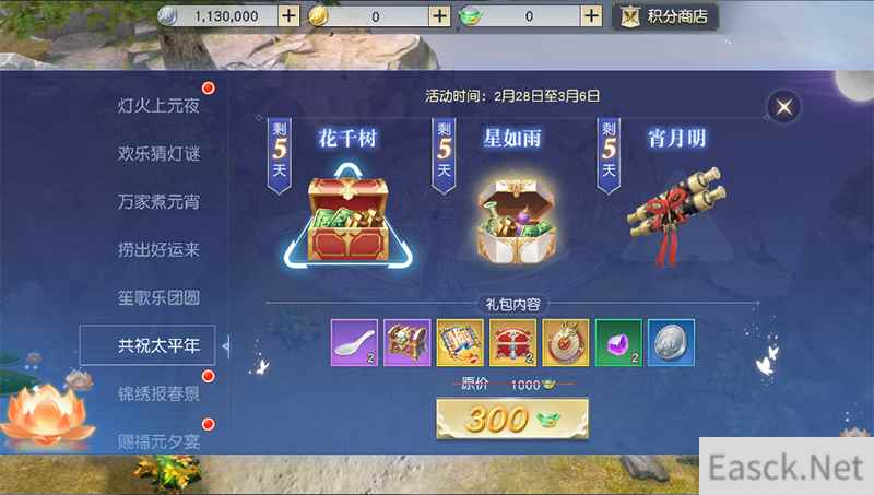 2月28日至3月6日,“花千树”、“星如雨”、“宵月明”三款礼包上架,珍稀挂饰“画中镜”将与天命者们见面;3月7日至3月13日,“良辰景”、“鱼龙戏”、“琉璃春”三款礼包降临,绚丽步尘“繁星”等着天命者们带回家!