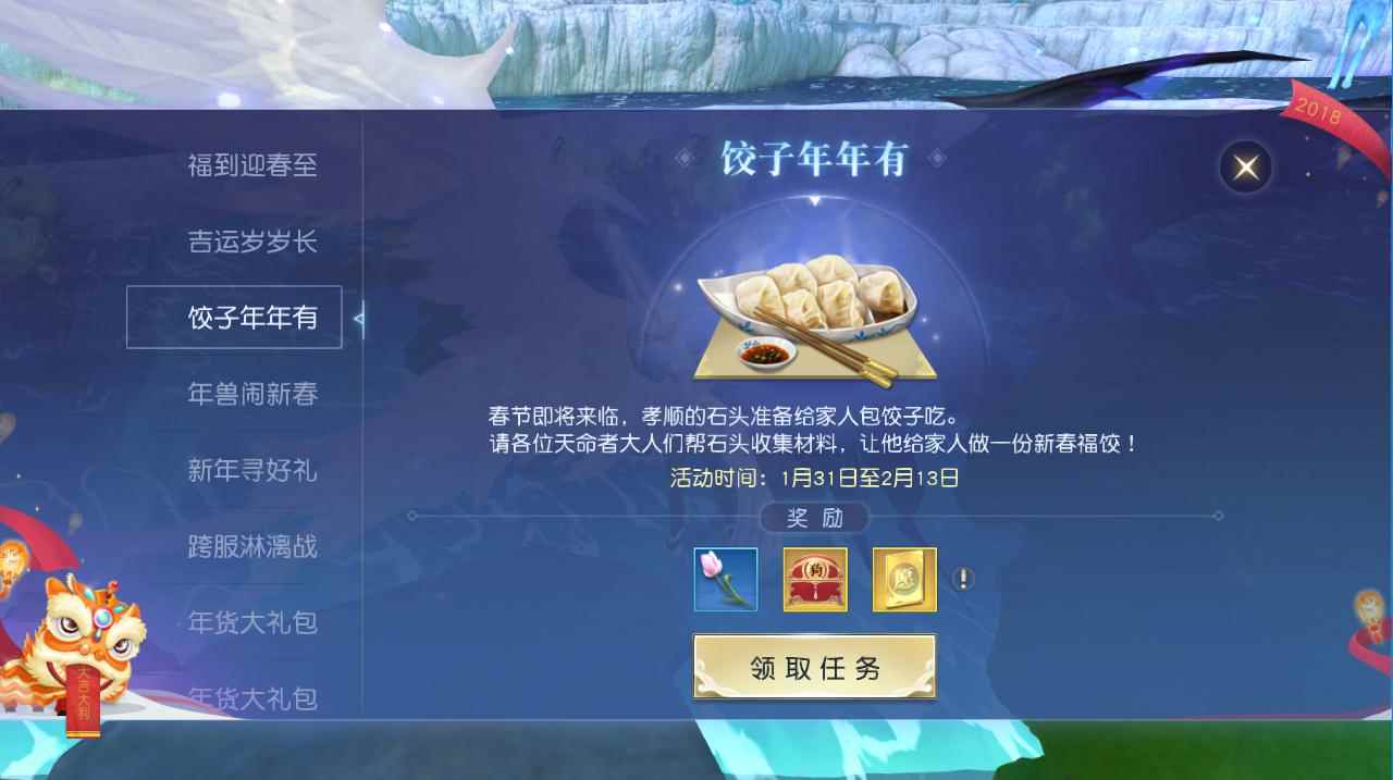 除了按时上线领取奖励,《镇魔曲》还在1月31日至2月13日期间为天命者们备下了新春佳节的传统贺礼!帮助石头包饺子,团团圆圆过除夕,体验新春佳节传统乐趣之余,还能收获石头备下的厚礼:迎春花、新春手信、祈愿卡等珍贵奖励全数送上!