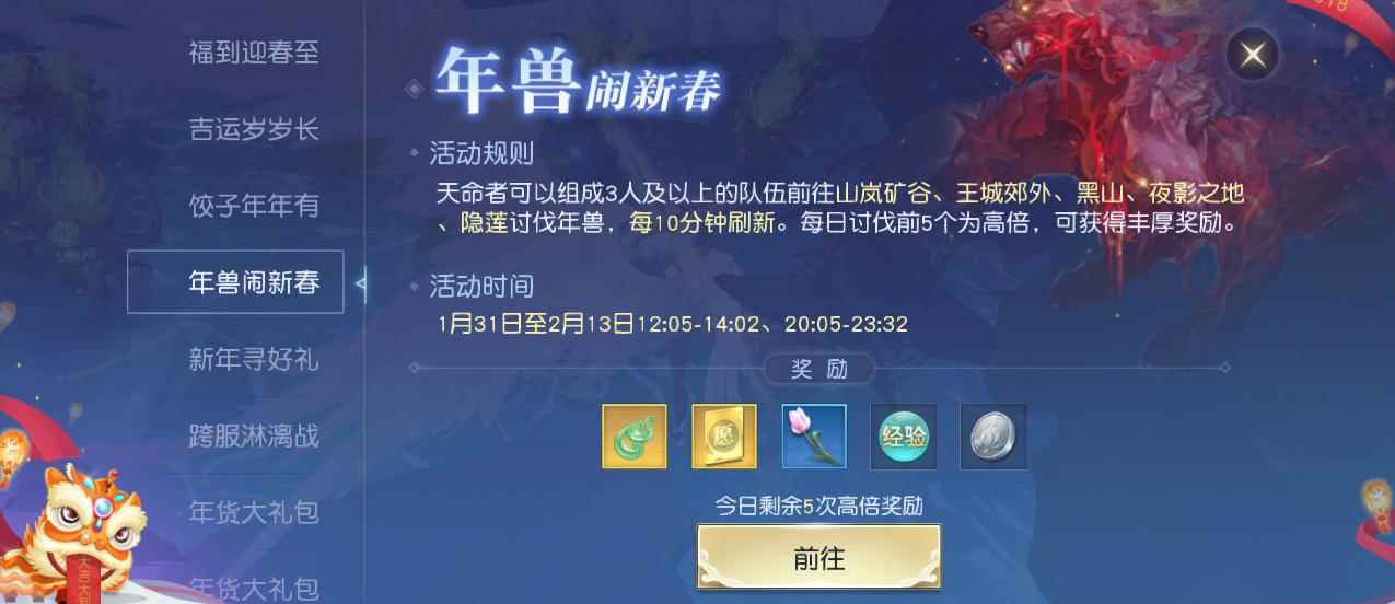 1月31日至2月27日,五大新春活动持续整月、全服开启!每位天命者均可参与其中,在《镇魔曲》里过一个热热闹闹的欢乐年!