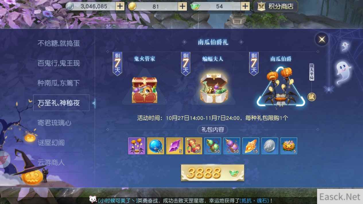 在“万圣礼,神秘夜”活动中,为天命者们准备了三个不同档次的礼包。朱颜染、璀钻、石火精、各类葫芦等珍稀道具大放送,最重要的是“南瓜伯爵”也在其中!
