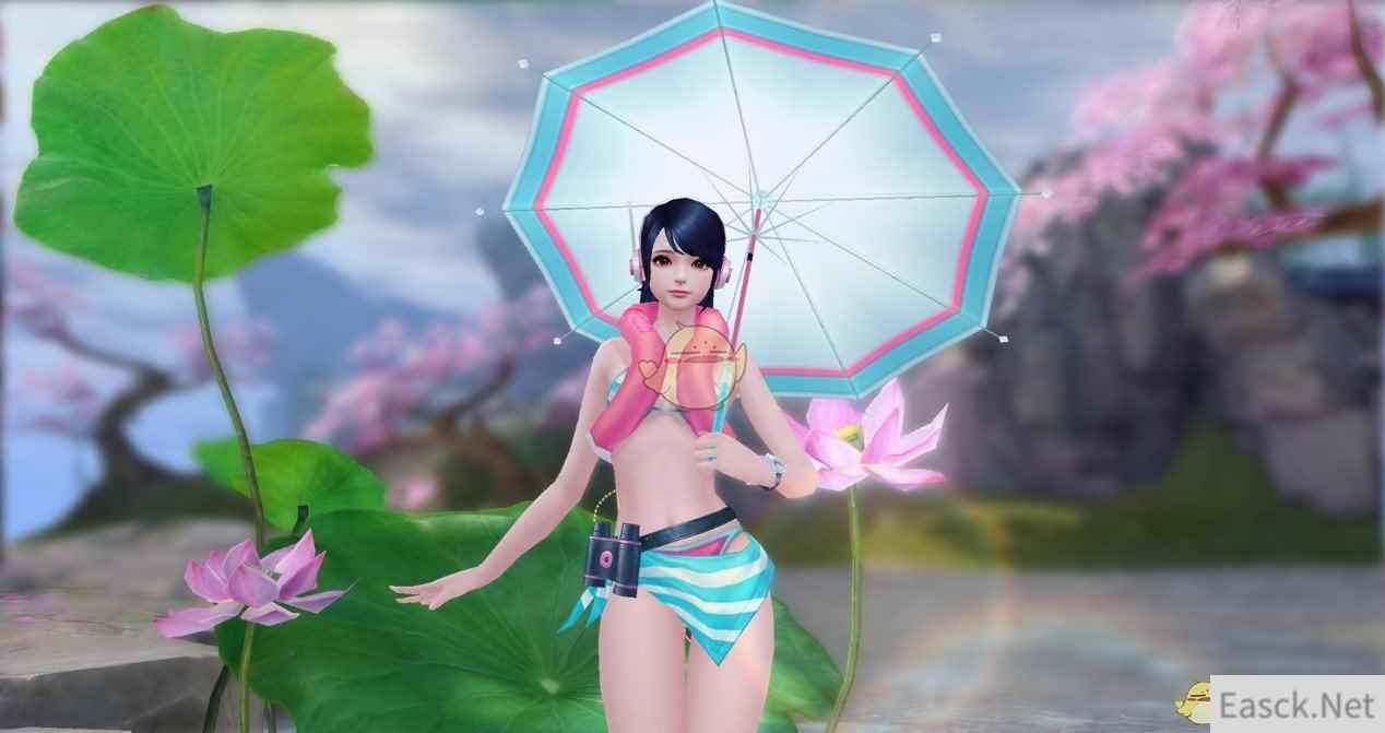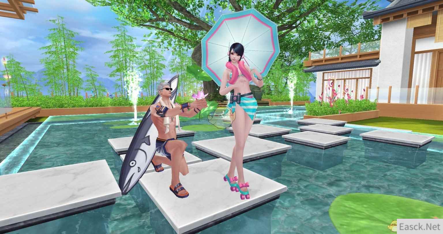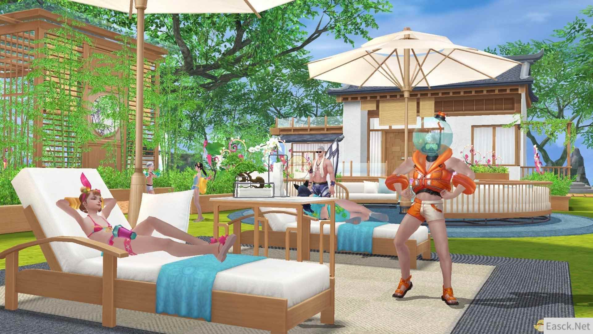 镜头再转,开放式庭院里竹影摇曳随风而舞,充满江南园林风情的院落中,一处现代化的游泳池掩映其间。清澈的池水、大大的遮阳伞、舒服的沙滩椅,让穿着泳装的八部众们尽情嬉闹,清凉无边!