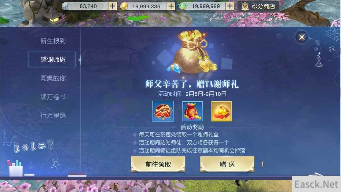 “一日为师终生为父”,是中华民族的优良传统。9月开学季伊始便是教师节,为此《镇魔曲》手游特别准备了“感谢师恩”活动:天命者们每天都可以找到神秘女主化身的新同学领取“谢师礼盒”。天命者们只需要把“谢师礼盒”送给自己的职业导师,或是在中州大地上闯荡时拜下的师父,就能获得各类高级道具作为回报——送给是师父所得到的奖励更丰富!