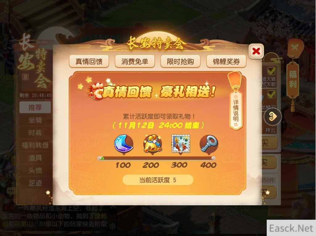 在长安特卖会开启期间,《梦幻西游》手游还为诸多玩家开启真情回馈活动。玩家只需完成游戏日常,积累活跃度,即可获得3级月亮石、修炼大礼包、路在何方挂件和银钥匙等奖励。积累越多的活跃度,玩家所能获得的奖励也将更丰富哦!