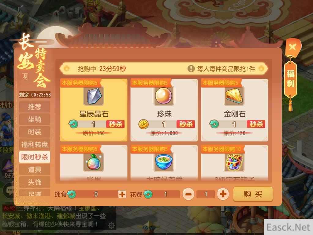 在长安特卖会开启期间,玩家购买对应商品还将获得一定数量的仙玉、金币、银币返还,更有免单特权等待玩家参与!