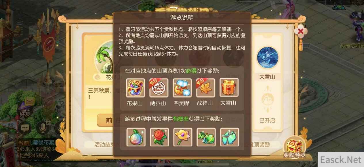 在攀登过程中,玩家也将触发诸多特殊事件,获得包括彩果、玫瑰花、金兰花、金柳露、法宝碎片在内的好礼。而完成登顶的玩家,也将根据登顶地点,解锁3级宝石箱子、重阳记忆贴纸、仙气礼袋、枫叶贴纸、以及重阳礼袋一份。