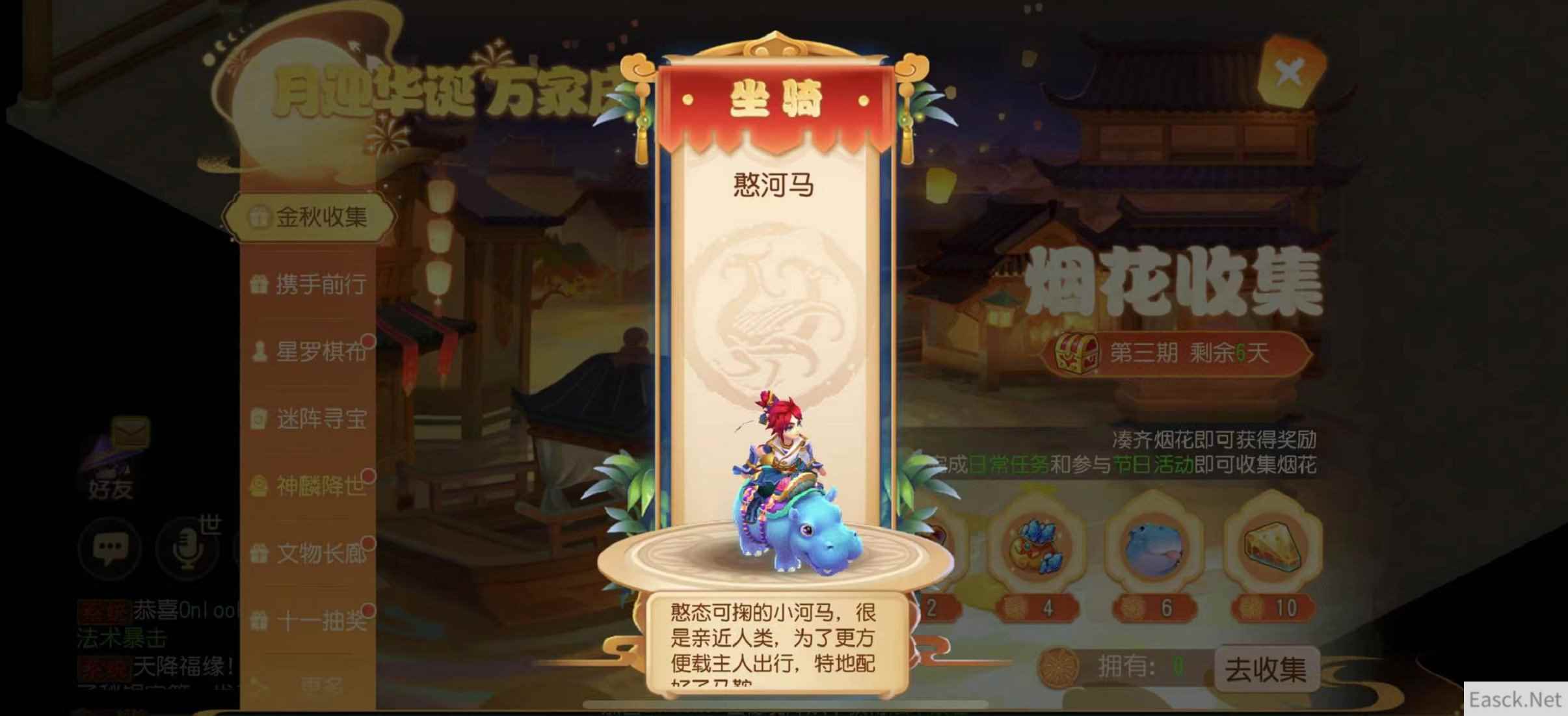 作为贯穿双节活动整个周期的常驻版块,金秋收集现在已经开启第三期。这一次,玩家将追随吉里吉里和咕噜咕噜前往城河泛舟,点燃烟花。玩家只要完成每日活跃度任务以及他们发布的每日收集任务,就可以获取烟花积分,兑换永久免费坐骑憨河马和高级五宝。