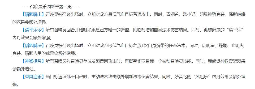 从本周三开始,除九幽囚魂、巨灵之蛮两个原有主题外,《梦幻西游》手游召唤灵乐园将新增瞬影瞬击、清平乐令、瞬影瞬法、神猴捞月、乘风追乐五大全新主题。也就是说,玩家之后将有七大主题可以每周轮流体验,这一方面丰富了该活动的可玩性,另一方面也让特定召唤灵有了更多的表现机会。所以,玩家不妨根据每周指定主题携带合适的召唤灵参与其中,让自己的战斗事半功倍!