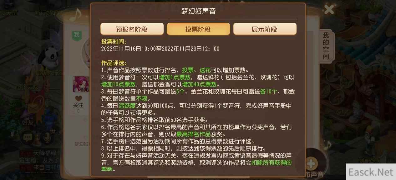在投票期间,玩家可为喜爱的声音投放梦音符或送花以增加其票数。其中,玩家使用梦音符一次可增加1点票数,而赠送鲜花则可增加10~40点票数。玩家通过积累每日活跃度或完成好声音手册任务即可获取梦音符哦!