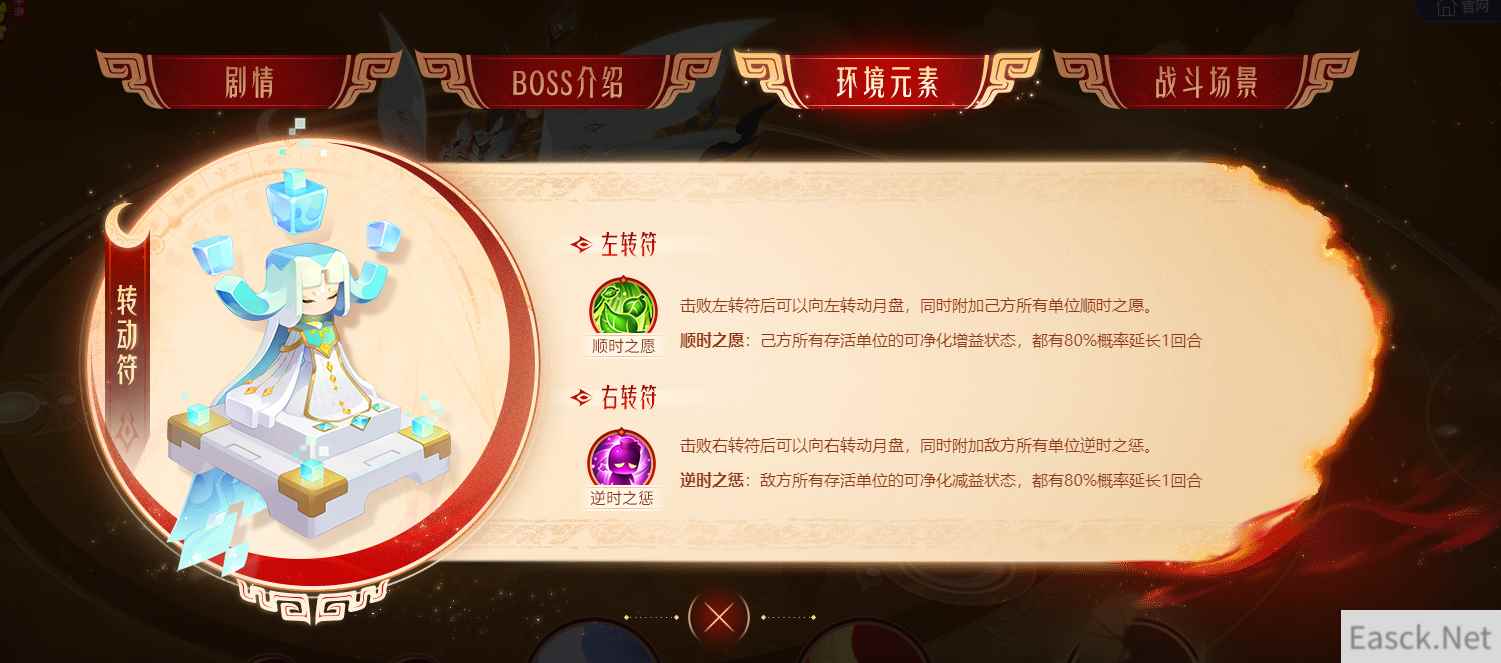 月盘机制分为新月、炎月、赤月三相,每个月相各有特点。在战斗中,玩家需要妥善利用环境元素转动符进行时空穿梭,以规避对己方不利的月相。如玩家击杀左转符,可向左转动月盘,同时使己方所有存活单位的可净化增益状态有80%的概率延长一回合。