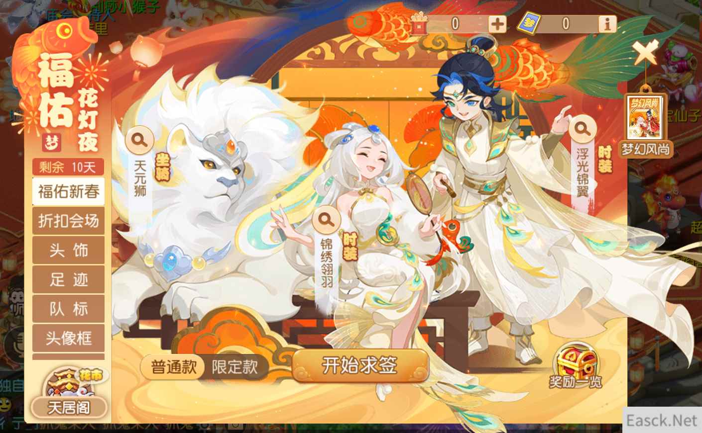 若投出了六根上上签,玩家更将解锁新春全新时装锦绣翎羽/浮光锦翼,或全新坐骑天元狮等外观大奖哦!另外,玩家每次抽取福签,系统都将为你累积一定的福运值。当福运值满后,你的下抽同样必出金色外观大奖,各位想与新春限定外观结缘的朋友切勿错过啦!