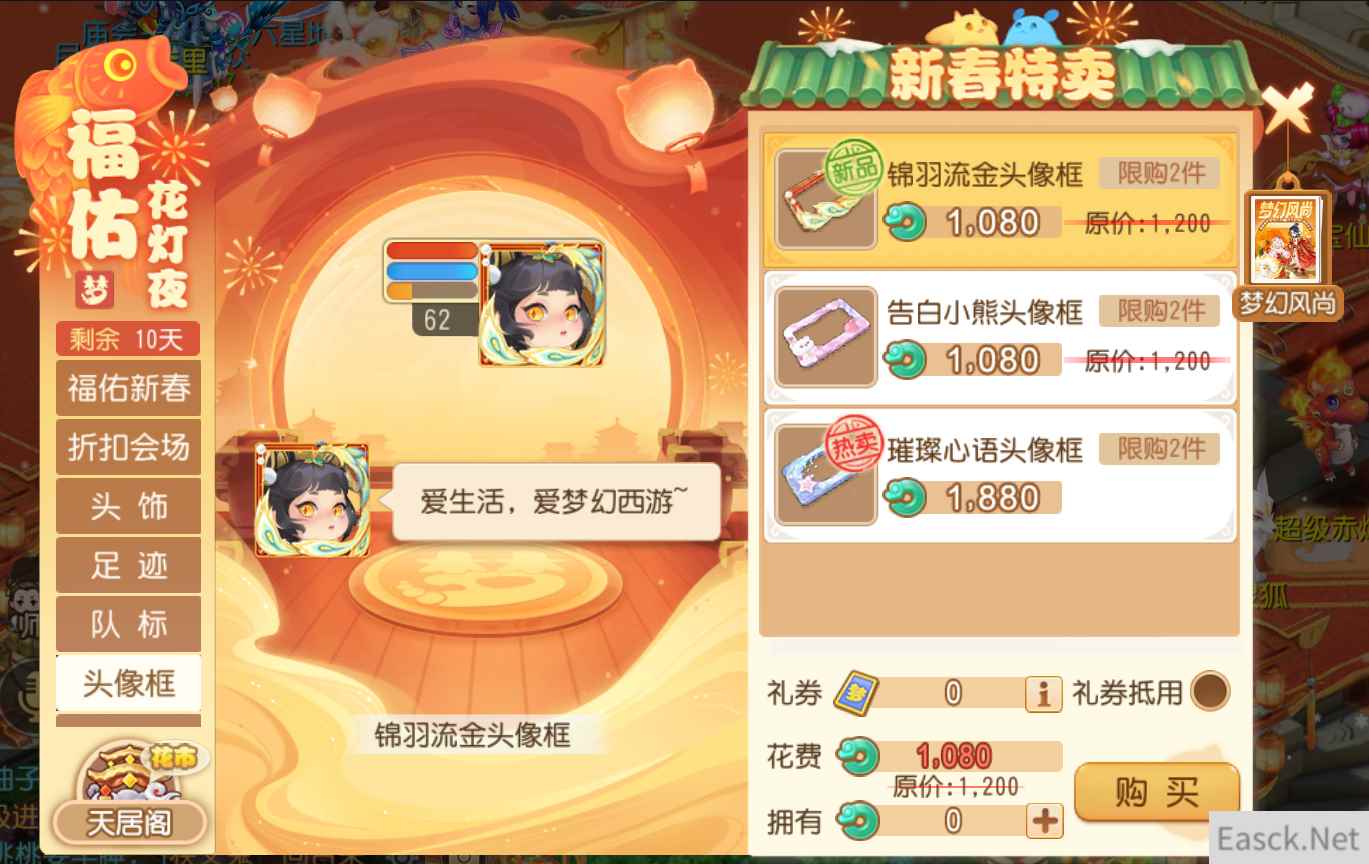 伴随着福佑新春活动的开启,特卖商城和天居阁也同步上新啦,为大家带来了全新锦羽流金系列头像框、冒泡框、空间秀、空间挂件,流金狮面足迹,翎羽扇队标和雁归巢头饰等新春外观!更有兔兔送福、万家灯火、玉兔迎春窗花等全新春节家具等你来选购!现在,大家不妨前往商城中选购自己中意的饰品,让自己喜气洋洋地迎接农历新年的到来吧!