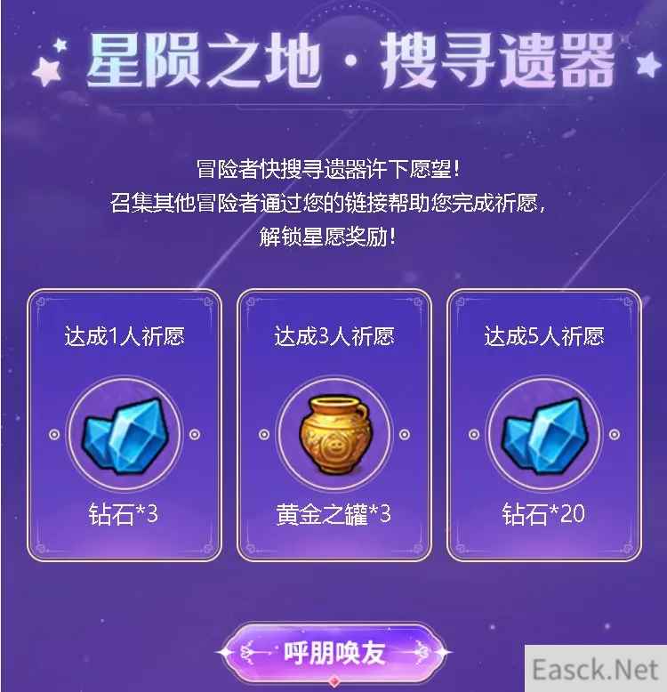 伴随着新迷宫的上线埃拉西亚大陆的一角从星空坠下了无数的星遗器活动期间靓仔们可以发送你的专属链接给好兄弟帮助你实现更多祈愿!成功邀请到的兄弟当然也少不了奖励啦!达成1位、3位、5位好兄弟的祈愿时可获得对应档位的游戏道具奖励