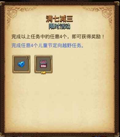最后为了让大家在快乐日子里,轻松获得迷宫更多奖励,贴心减负活动【满七减三】也来啦,只要完成以上4个任务,轻松拿到钻石及加速器。